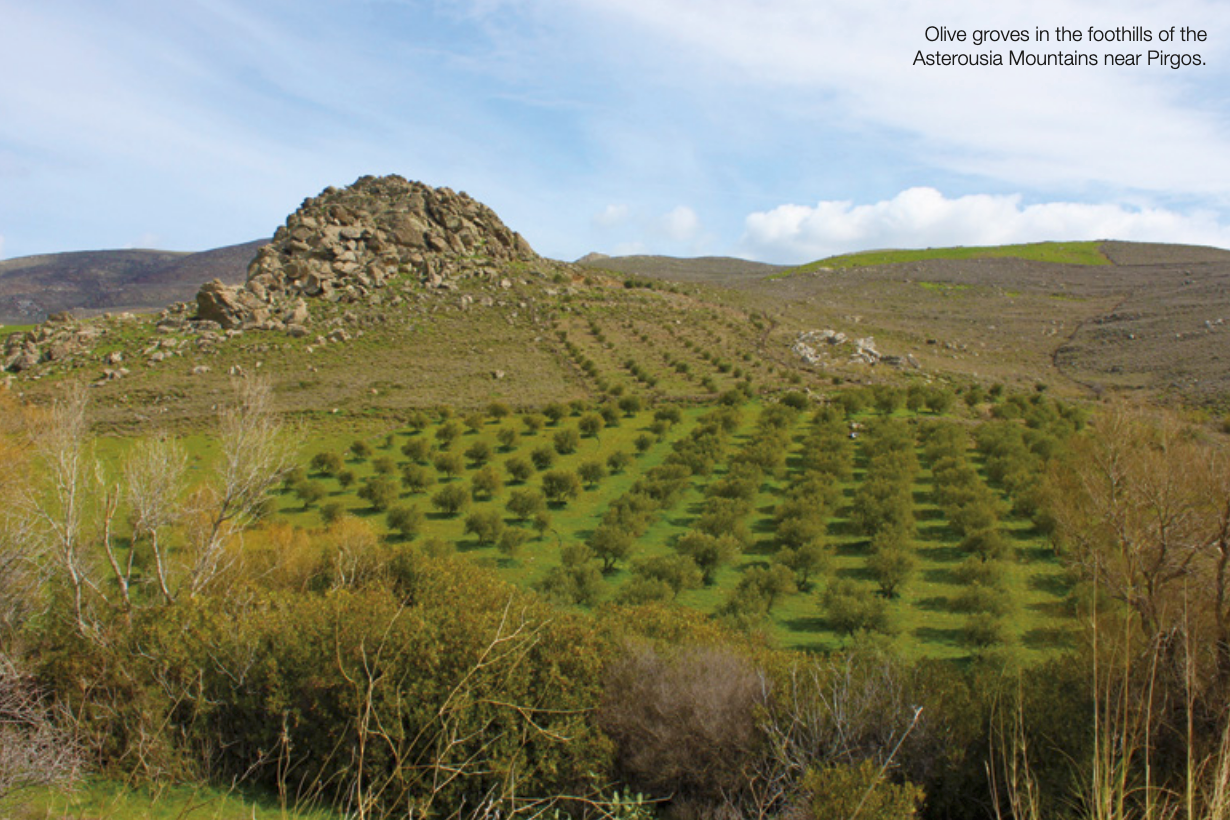 loom high over the Mesara Plain, an expanse of olive and